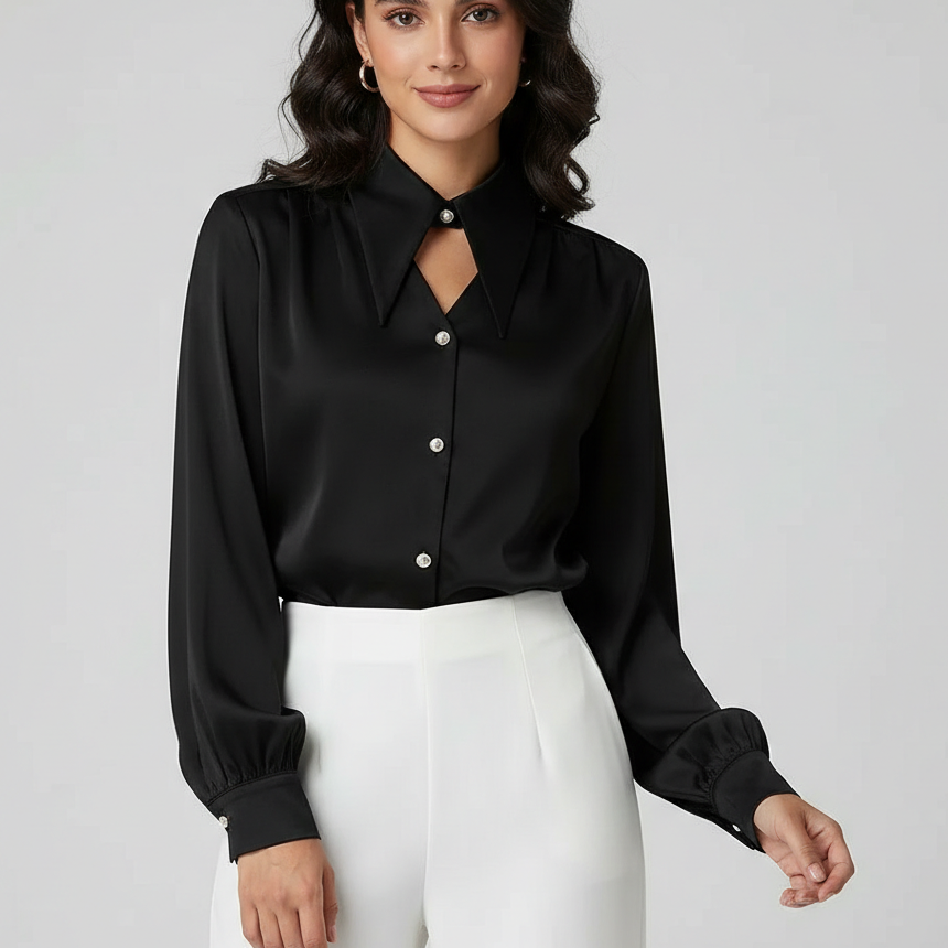 Confeccionada em cetim premium de toque sedoso e caimento impecável, essa blusa Anabeaz combina gola clássica estruturada, manga longa elegante e fechamento frontal com botões refinados. Uma peça versátil que transita perfeitamente do escritório a eventos sociais, elevando o visual com sofisticação atemporal.