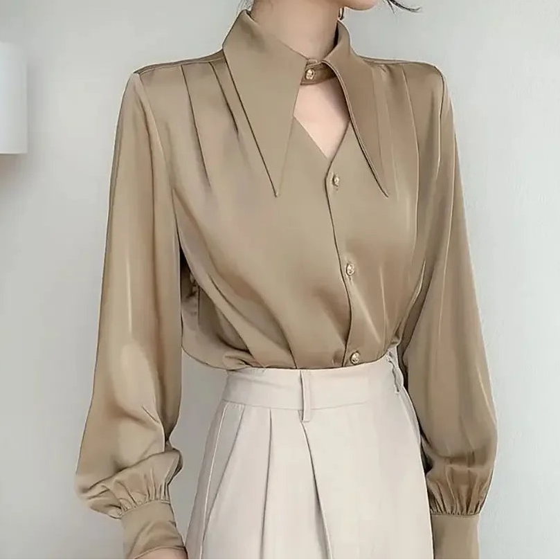 a blusa social em cetim que transmite autoridade, feminilidade e presença em qualquer ambiente profissional.